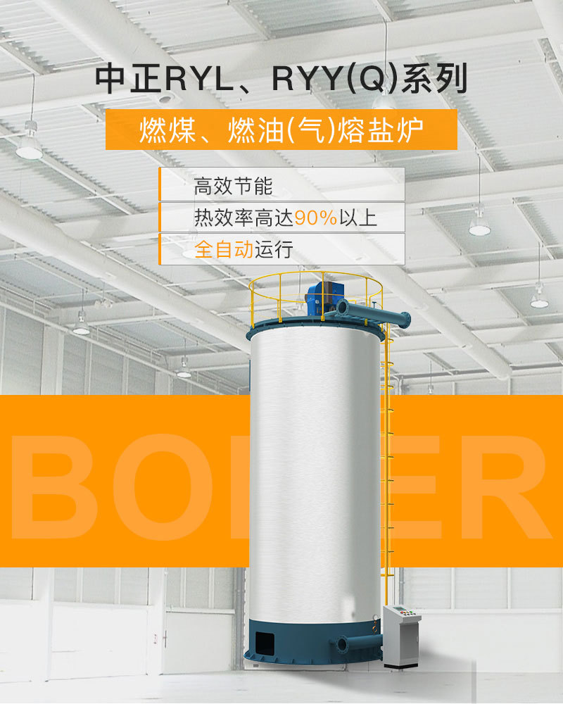 熔鹽爐是以熔化的硝酸鉀、亞硝酸鈉等的混合物為傳熱介質的鍋爐。熔化爐將粉狀的熔鹽加熱到熔點以上,直到熔鹽的粘度可以用循環泵推動,使整個系統成為流動可循環狀態后,送到熱載體爐進一步循環升溫,使其在流動狀態下循環使用。常用介質工作溫度為400-550℃,最高工作溫度可達600℃。
